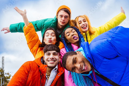 © oneinchpunch, Obraz premium Multiracial group of young friends meeting outdoors in winter - Multiethnic students with colorful winter jackets and stylish outfits having fun in the city