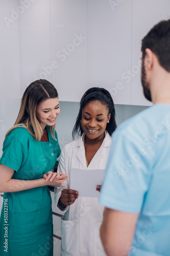 © Zamrznuti tonovi, Fototapeta premium Multiracial team of doctors discussing a patients condition while working in a hospital