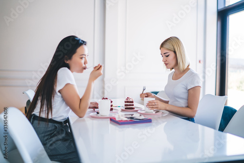 Fototapeta premium Multiracial women tasting cakes in cafe
