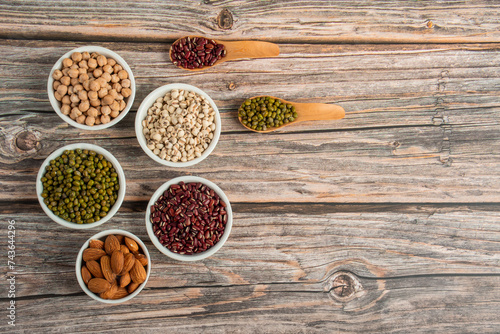 Fototapeta premium Mung beans, Red kidney beans, Chickpeas source and peeled barley in white cup on spoon wooden on wood background