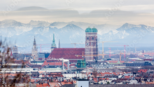 Obraz premium Munich, Bavaria / Germany - Feb 20, 2020: Frauenkirche with snow-capped alps...