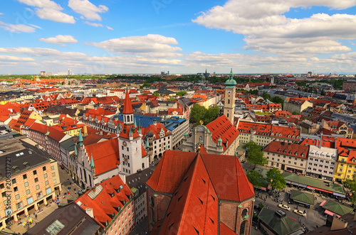 Obraz premium Munich historical center panoramic aerial cityscape. Old City Hall, Heiliggeist Church (Heiliggeistkirche) and red tile roofs of ancient building at spring day. Bavaria, Germany