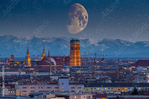 Fototapeta premium Munich skyline aerial view, munich night old town pre alps mountains.