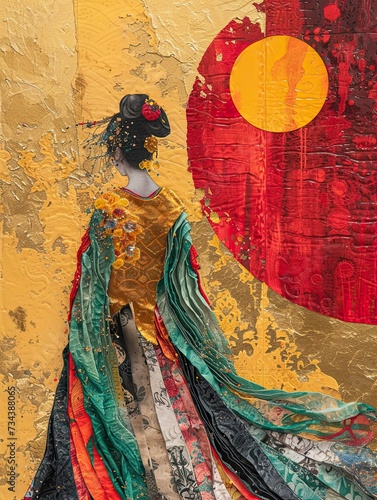 Fototapeta premium mural art of an Asian princess in colorful traditional costume, fresco, wall decor, back view of a woman, concept art, 3d wallpaper, abstract illustration, AI