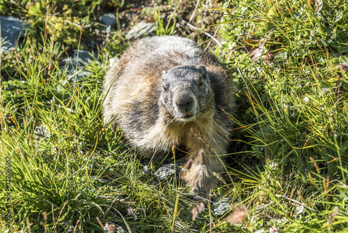 © Andy Ilmberger, Naklejka premium Murmeltier auf Wanderschaft in einer grünen Wiese