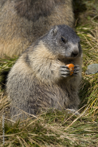 © Gisela, Fototapeta premium Murmeltier (Marmota marmota) frisst eine Möhre, Großglockner, Österreich