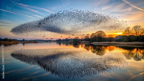 © Four888, Obraz premium Murmuration of starlings forms mesmerizing patterns in the sky, casting a mirrored reflection on the calm lake water, creating a stunning natural symphony.