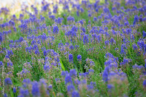 Naklejka premium Muscari Blooms in Sunlight: A captivating display of vibrant muscari flowers flourishes in a sunlit meadow, their delicate blue hues dancing in the gentle breeze.