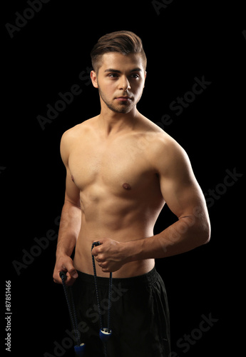 © Africa Studio, Fototapeta premium Muscle young man exercising with resistance band on dark background