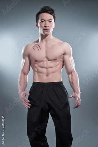 © ysbrandcosijn, Fototapeta premium Muscled asian kung fu man in action pose. Blood stripes on his c
