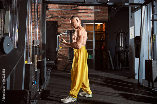 Naklejka premium Muscled man in comfortable sportsgear working out at gym