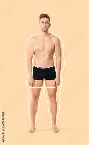 Fototapeta premium Muscled young man after weight loss on beige background