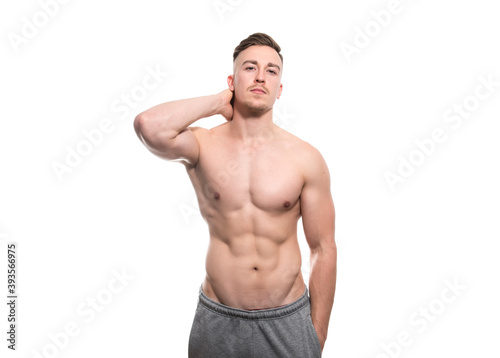 Fototapeta premium Muscular and fit bodybuilder shirtless torso isolated on white