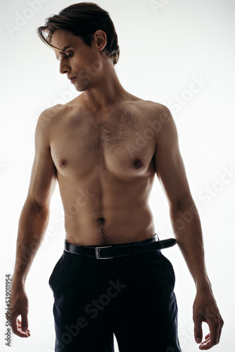 © LIGHTFIELD STUDIOS, Fototapeta premium muscular and shirtless man in black trousers posing isolated on white