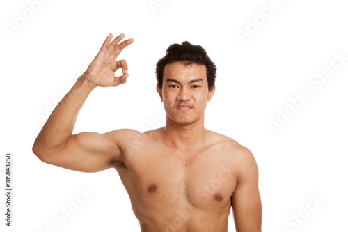 Fototapeta premium Muscular Asian man flexing biceps show OK sign