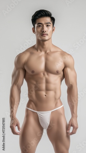 © PMBYTK, Fototapeta premium Muscular Asian Man with Athletic Physique on Gray Background