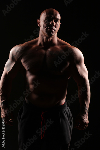 © vladimirfloyd, Fototapeta premium muscular bald man posing on a black background