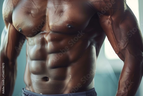 © juliars, Fototapeta premium Muscular black athlete is showing his six pack abs after an intense workout session