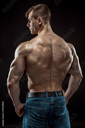 Fototapeta premium Muscular bodybuilder guy doing posing over black background