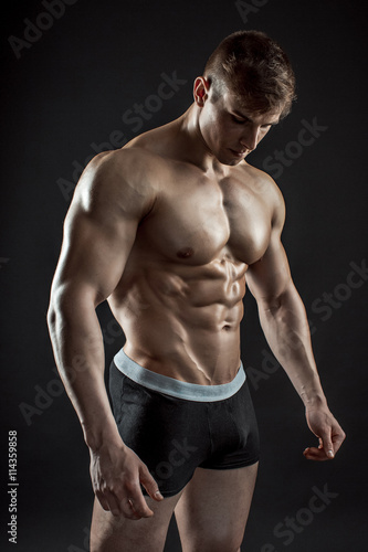 Fototapeta premium Muscular bodybuilder guy doing posing over black background