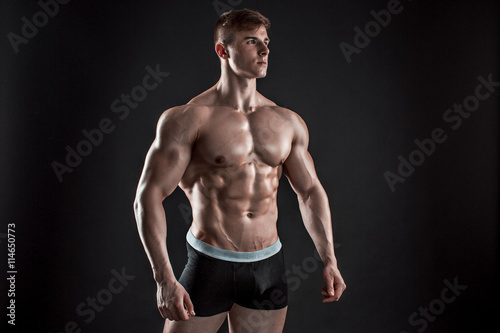 © nazarovsergey, Fototapeta premium Muscular bodybuilder guy doing posing over black background