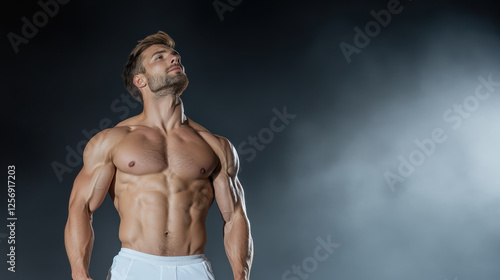 © siraphol, Fototapeta premium Muscular bodybuilder posing confidently under dramatic lighting