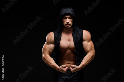 Fototapeta premium Muscular bodybuilder with jar of protein on a dark background. Sports nutrition. Bodybuilding nutrition supplements, sport, workout, healthy lifestyle concept.