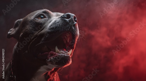 Fototapeta premium Muscular canine with open jaws poses dramatically against a background of deep crimson smoke
