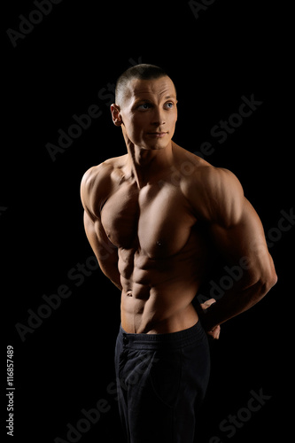 © serhiibobyk, Fototapeta premium Muscular fitness man on black background