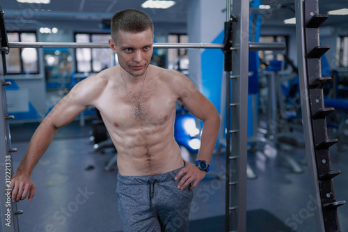 © Дмитрий Хитрин, Naklejka premium Muscular guy with nude torso trains in gym