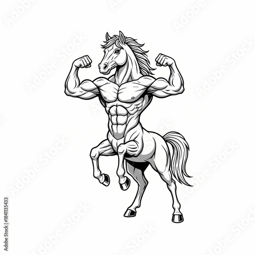 © Ikhsani, Obraz premium muscular horse mascot for gym and fitness black and white line art vector illustration