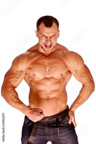 © salagatoxic, Fototapeta premium Muscular male bodybuilder on white background