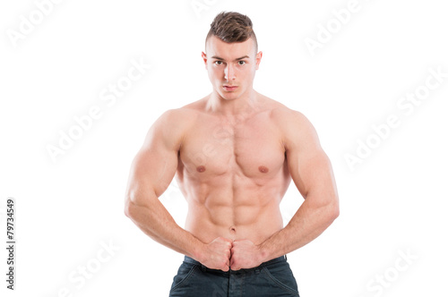 Fototapeta premium Muscular male model flexing abs and arms
