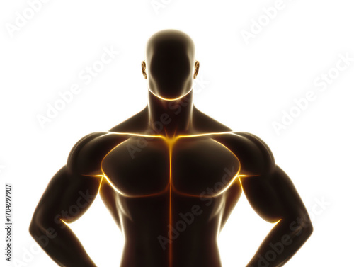 Fototapeta premium Muscular male torso illustration with glowing golden highlights, athletic build, strong chest, defined arms, fitness concept, modern digital art, confident pose