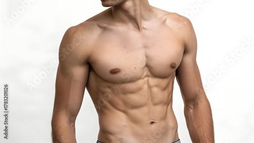 © Shah Faisal, Fototapeta premium Muscular Male Torso Showing Defined Abs and Chest on White Background