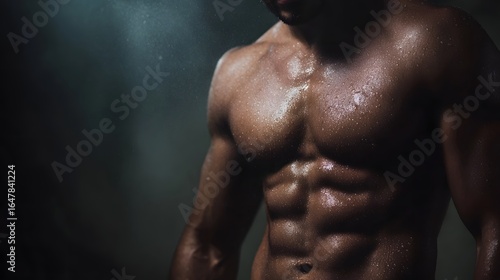© Thares2020, Fototapeta premium Muscular male torso with defined abs in a gritty gym setting