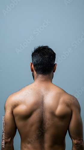 © Nadiyah, Fototapeta premium Muscular Man Back, Studio Shot, Grey Background, Fitness, Health.