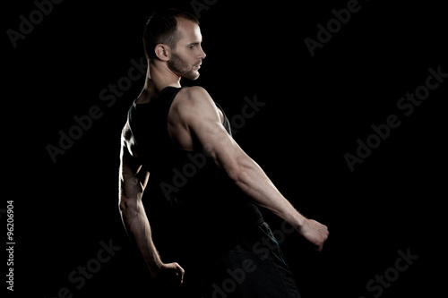 © Ulia Koltyrina, Naklejka premium muscular man, clasps hands in fist, black background, place for text on the right