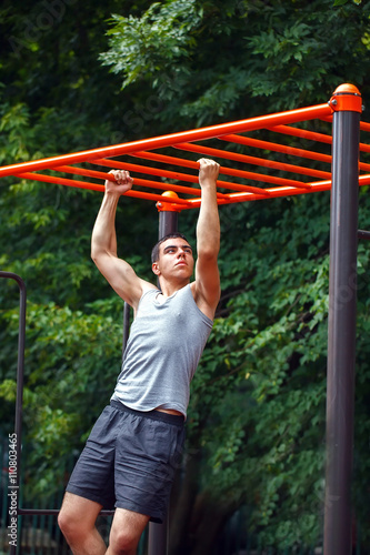 Obraz premium Muscular man doing pull-ups on horizontal bar