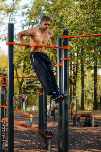 Fototapeta premium Muscular man doing pull-ups on horizontal bar