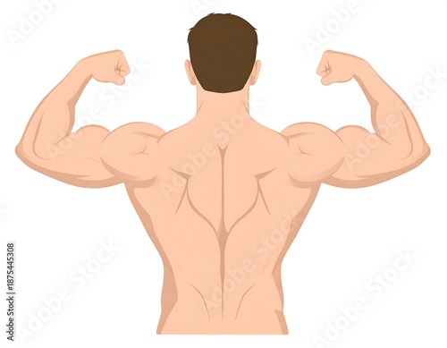 Fototapeta premium Muscular man from back view, flexing biceps, tan skin and brown hair, white...
