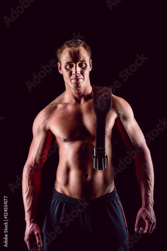 Fototapeta premium Muscular man in with lifting belt posing over dark background.