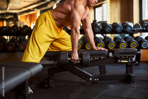© Svitlana, Naklejka premium Muscular man performing a triceps kick-back exercise