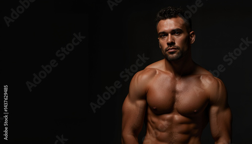 © Nikole24, Fototapeta premium Muscular man posing against black background, for fitness advertising