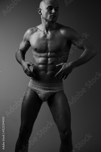 Fototapeta premium Muscular man posing confidently in black and white, showcasing strength and...