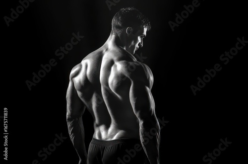 © Olya, Fototapeta premium muscular man posing shirtless with back muscles flexed in dramatic black and white lighting
