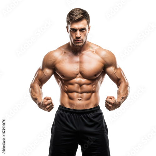 © Rabia, Fototapeta premium Muscular man posing with defined abs and biceps powerful physique in fitness studio lighting transparent background