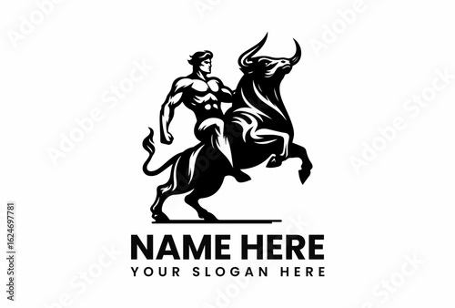 © vectorvovdesign, Fototapeta premium Muscular Man Riding a Rearing Bull in Striking Black and White Silhouette.