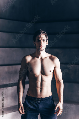 Fototapeta premium Muscular man shirtless. Handsome man with perfect body after training in dark studio.