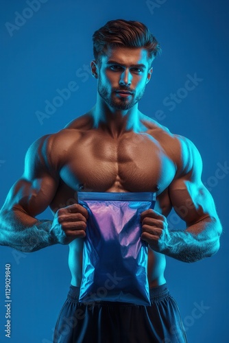 © anatolii, Obraz premium Muscular man showcasing fitness supplement bag in a blue-lit studio setting during a photo session focused on health and strength